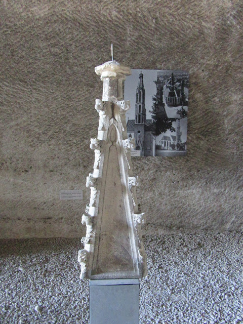 A fal mellett kövületek, az állványokon óriás kagylók álltak. Volt ott egy akkora cápa állkapca, hogy túratársam egyenes derékkal, akár a pálmák, simán besétált a félelmetes fogak közé. Hát, aki élőben találkozott egyszer ezzel a gyilkológéppel, az biztos nem mondta, hogy összefutottam egy cuki halacskával. Az őslények birodalma után megnéztük a színházat, majd a kőbányászat történetét feldolgozó szekciót is. Volt a kiállított tárgyak között XV. századi kőfaragvány, neogót fiatorony a Kecske-templomból.